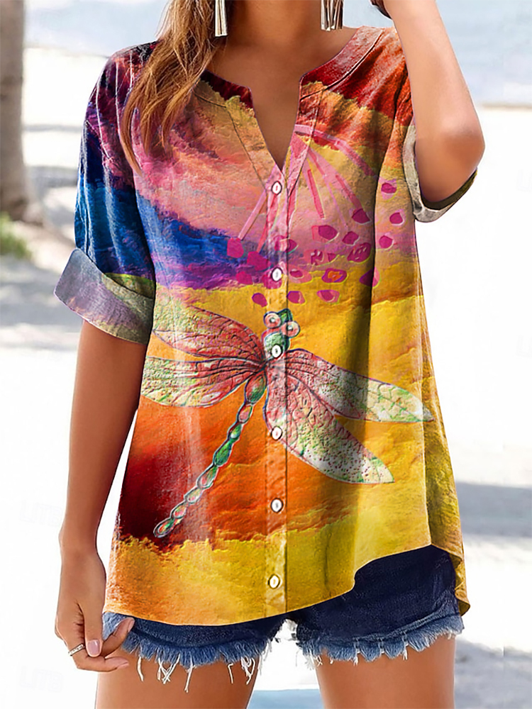 Women's Dragonfly Colorful Pattern Art Print Casual Cotton Linen Short Sleeve Shirt