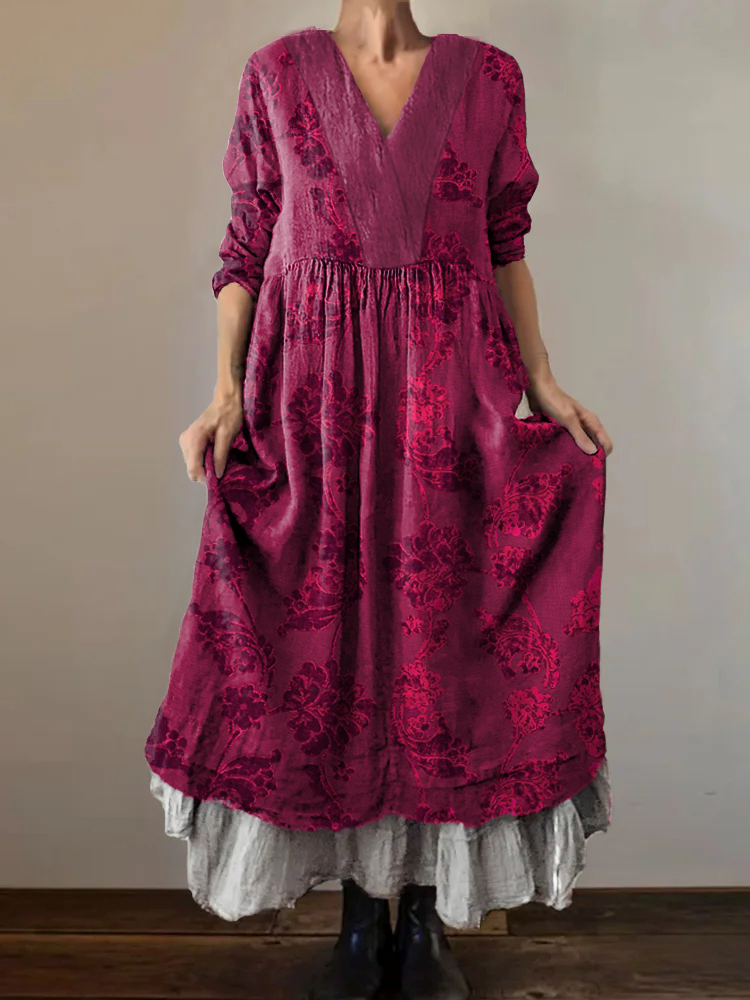 Women's Ethnic Floral Art Pattern Print V-Neck Pocket Cotton Dress