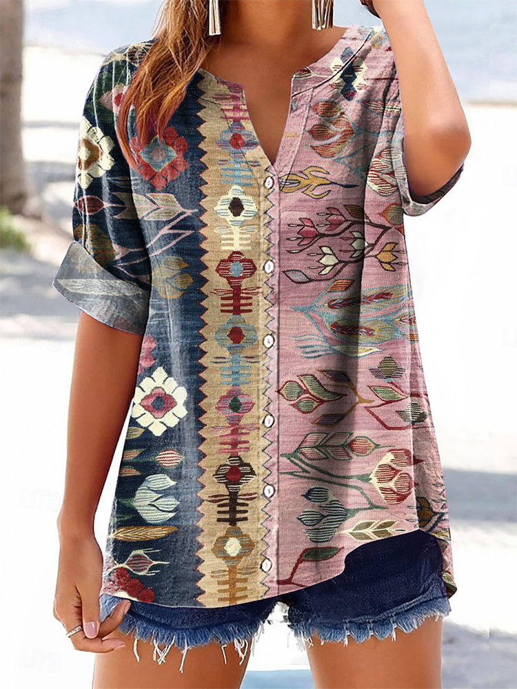 Women's Ethnic Style Tattoo Pattern Art Printed Cotton and Linen Casual Shirt