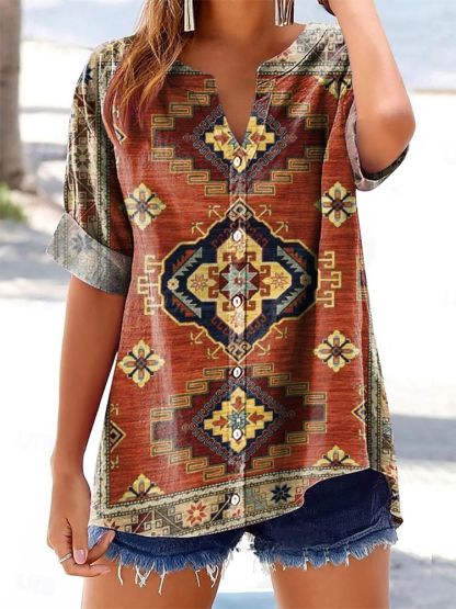 Women's Ethnic Style Tattoo Pattern Art Printed Cotton and Linen Casual Shirt