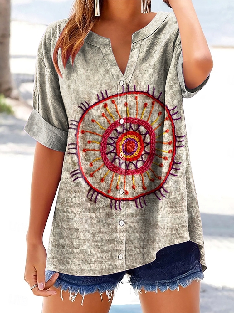 Women's Ethnic Texture Art Print Short-sleeved Cotton and Linen Shirt