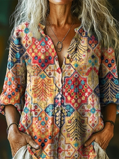 Women's Ethnic Totem Art Print Casual Cotton and Linen 3/4 Sleeve Shirt