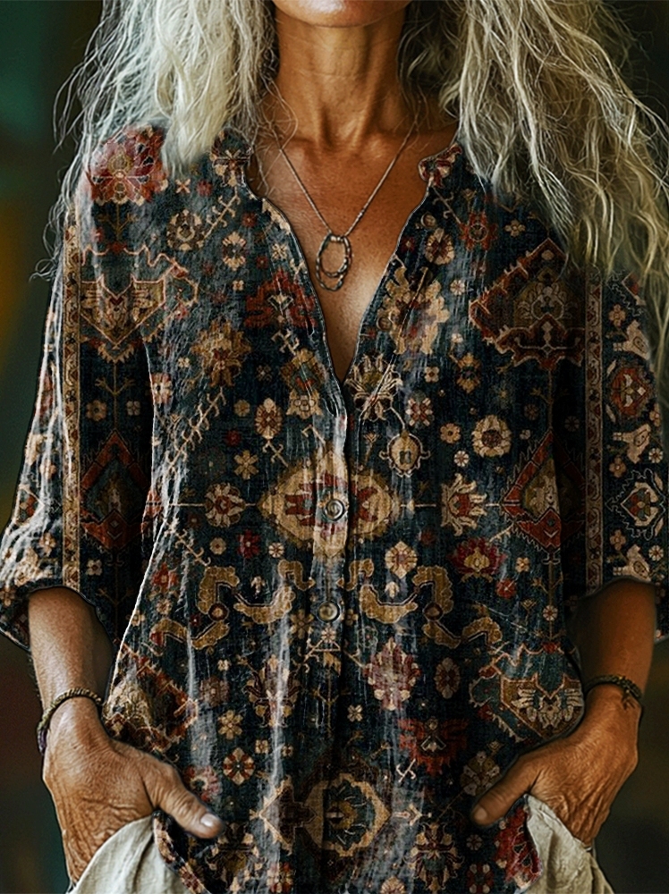 Women's Ethnic Totem Art Print Casual Cotton and Linen Shirt