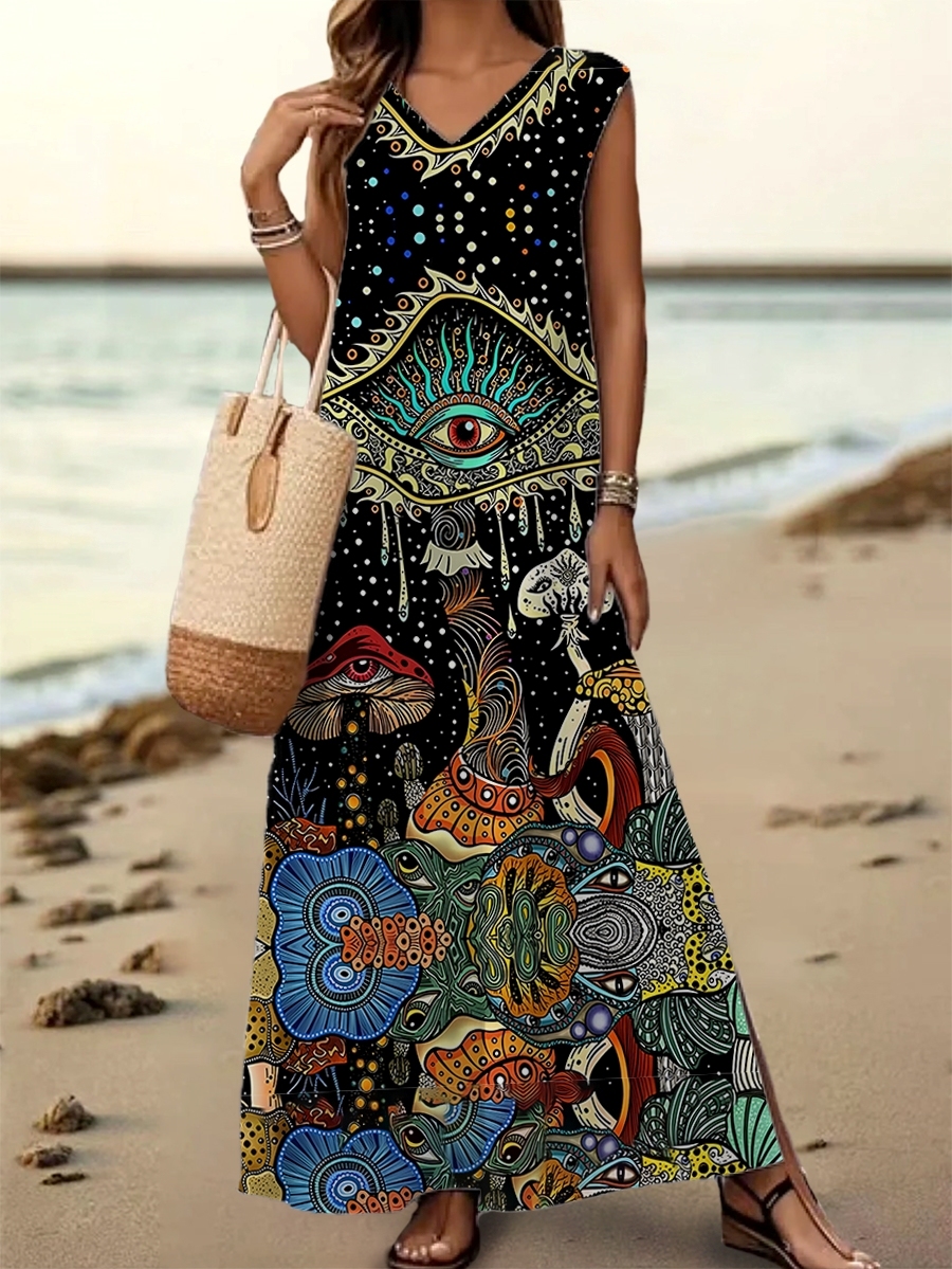 Women's Eye Mushroom Art Print V-Neck Sleeveless Cotton Pocket Dress