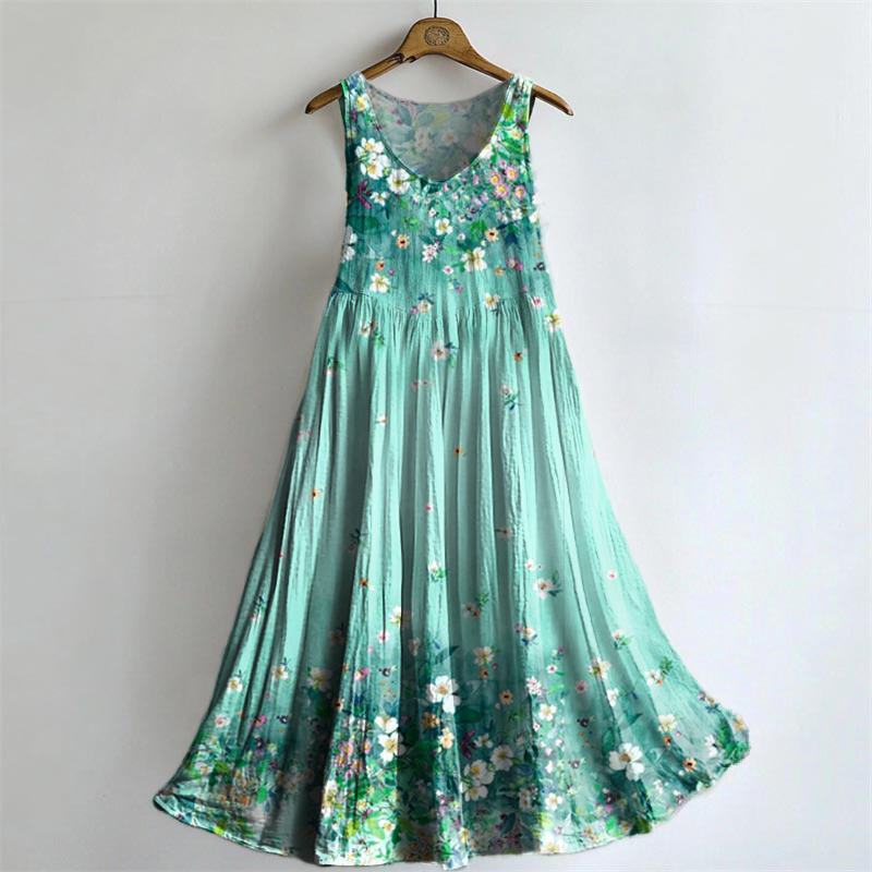 Women's Floral Art Print V-Neck Pocket Cotton Dress