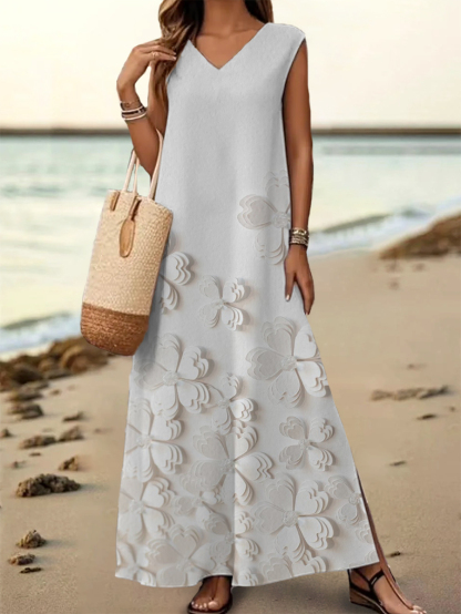 Women's Floral Art Print V-Neck Sleeveless Cotton Pocket Dress