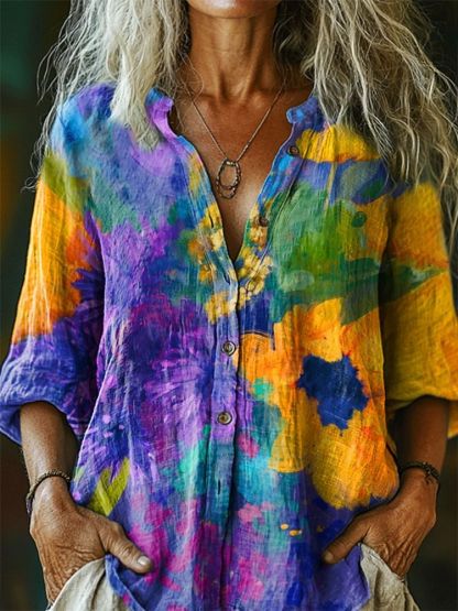 Women's Floral Pattern Art Print Casual Cotton Linen Shirt