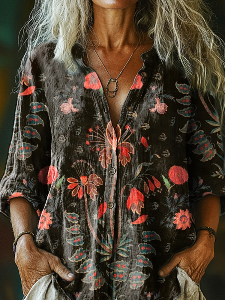 Women's Floral Pattern Art Print Casual Cotton Linen Shirt