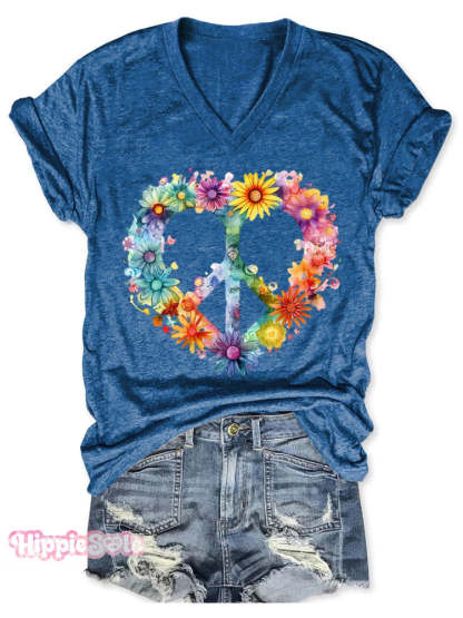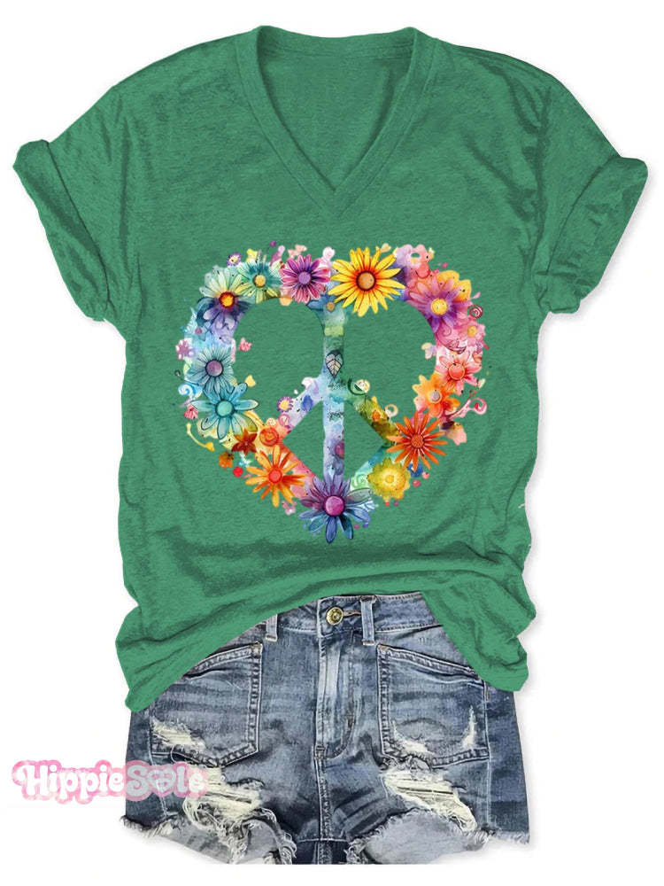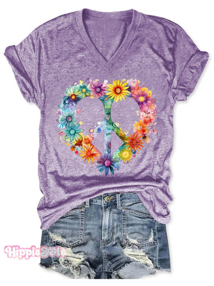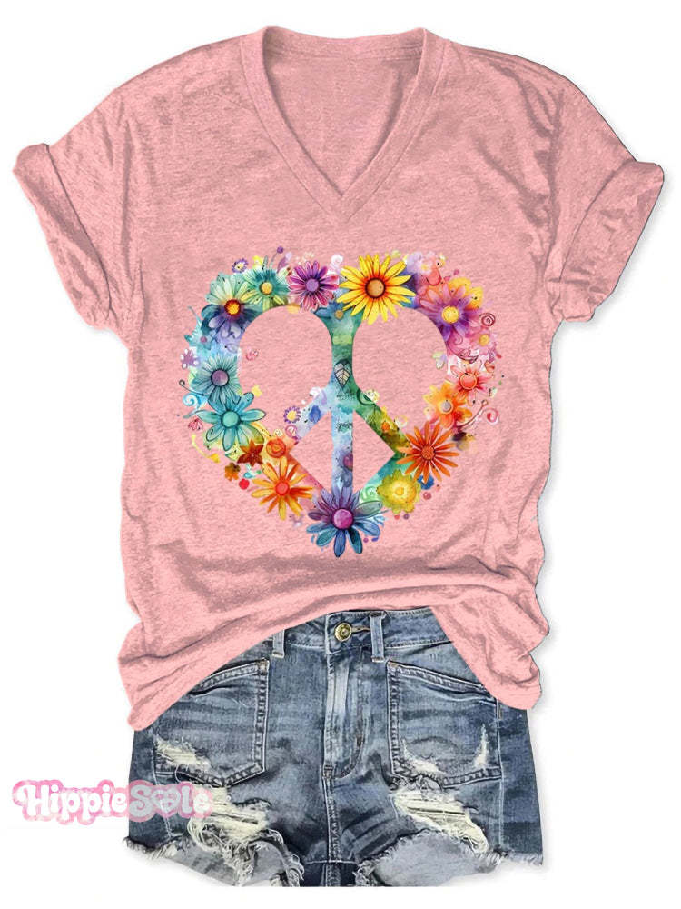 Women's Floral Peace And Love Art Print V-neck Casual T-Shirt
