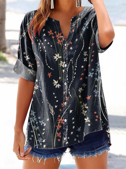 Women's Flower Art Print Casual Cotton And Linen Shirt