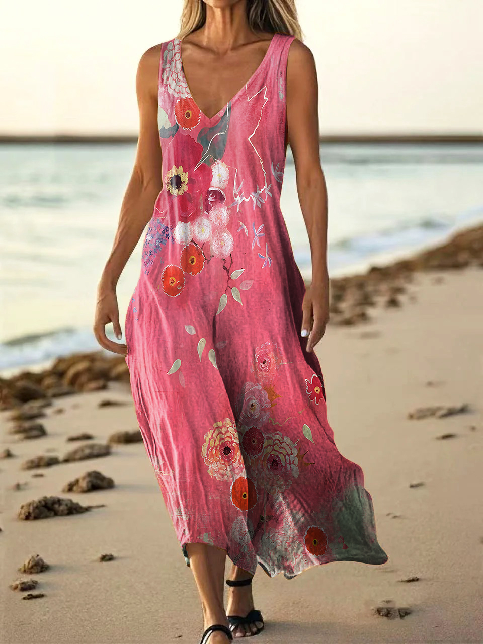 Women's Folk Art Floral Print V-neck Sleeveless Pocket Cotton Dress