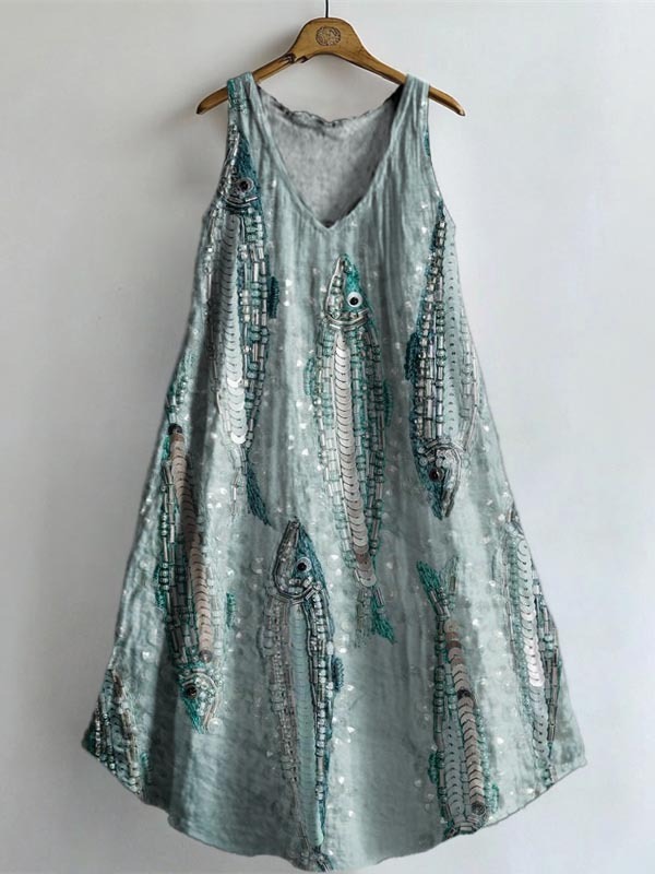 Women's Folk Fish Art Print V-neck Pocket Cotton Dress