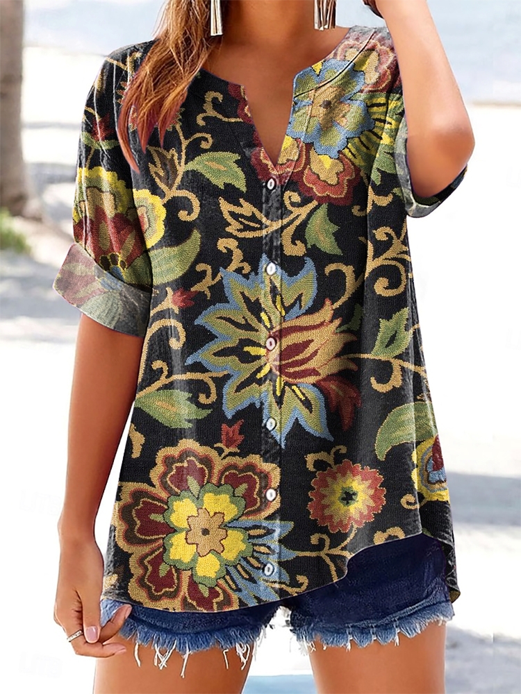 Women's Folk Floral Art Printed Casual Short Sleeve Cotton and Linen Shirt