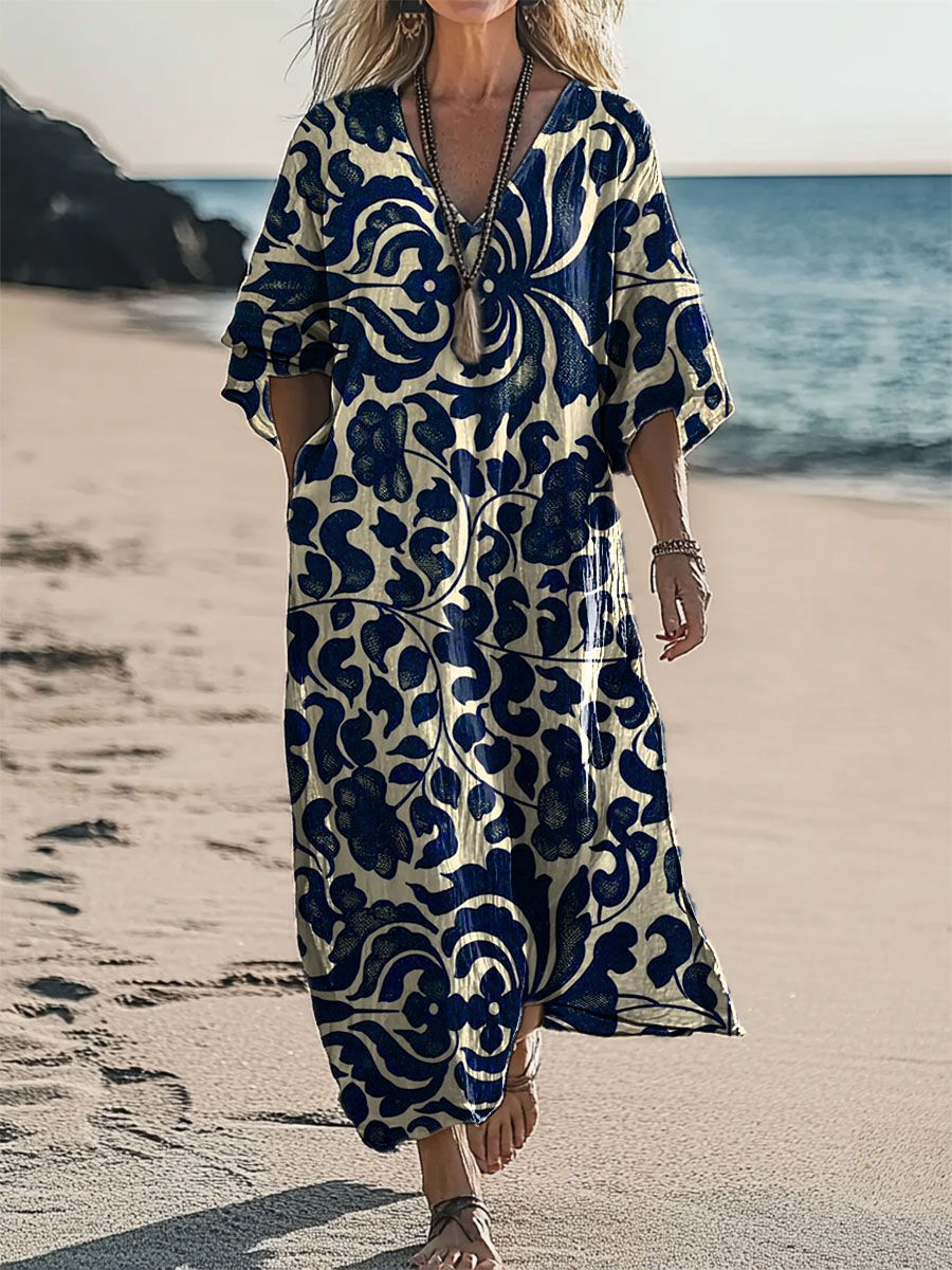 Women's Folk Floral Print V-Neck Comfort Cotton Pocket Dress