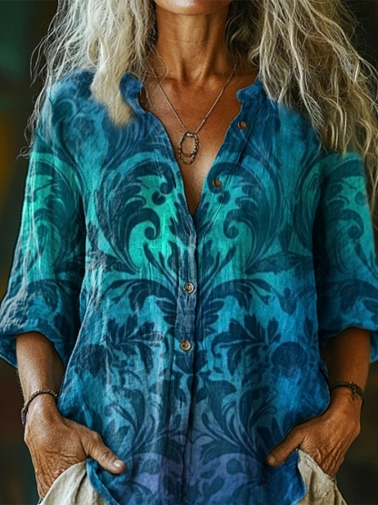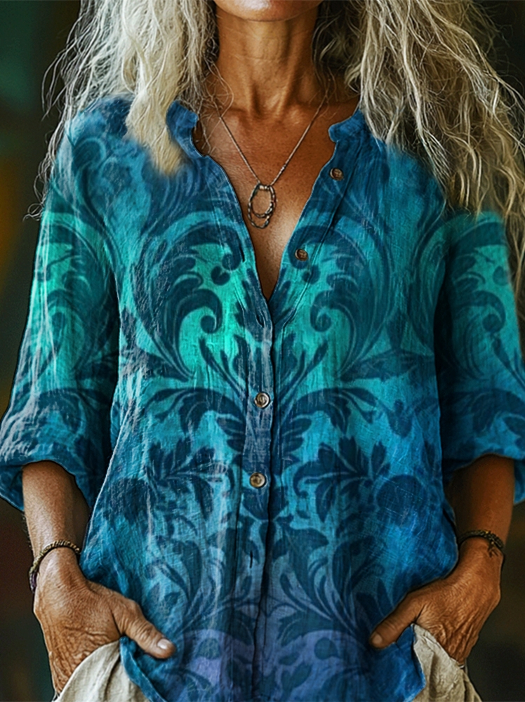 Women's Gradient Folk Floral Art Pattern Print Casual Cotton Linen Shirt