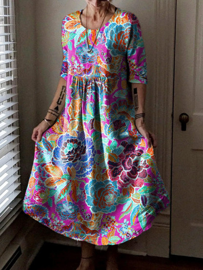 Women's Hippie Art Floral Print Crew Neck Dress