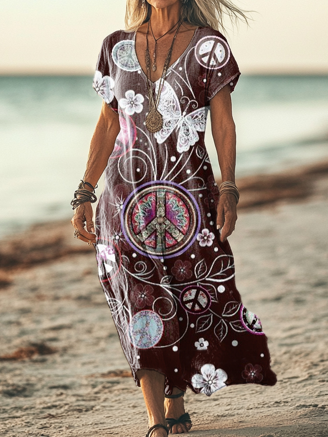 Women's Hippie Butterfly Art Print Pocket Cotton Dress