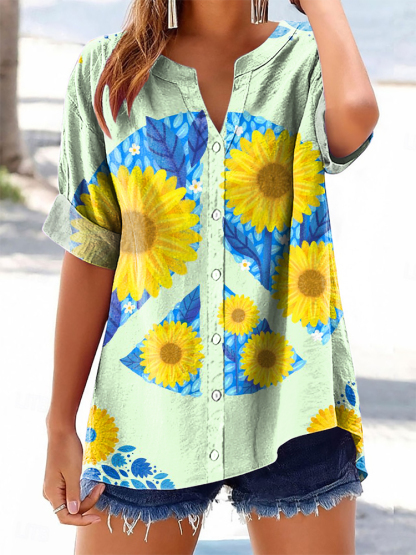 Women's Hippie Floral Art Print Casual Cotton And Linen Shirt