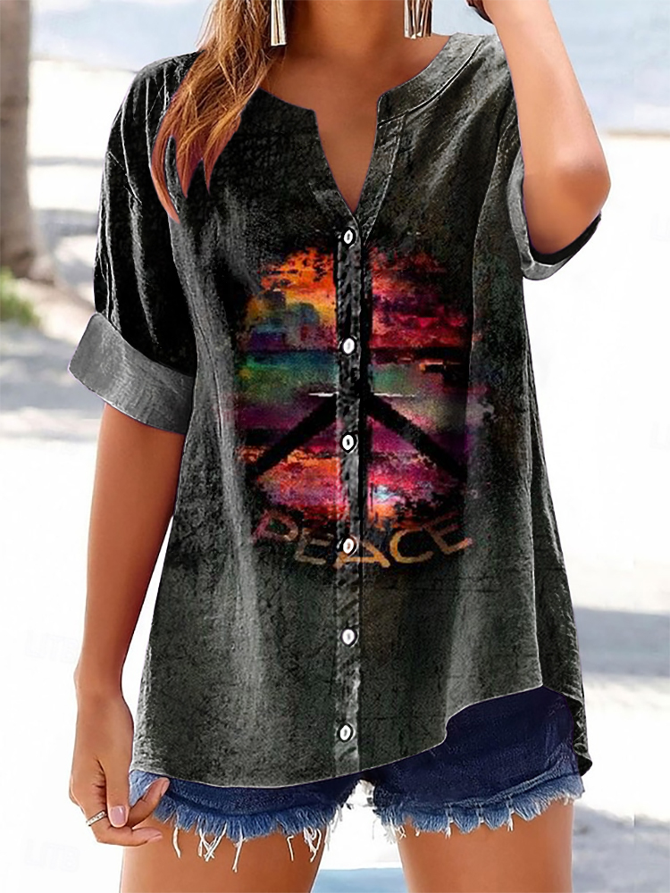 Women's Hippie Peace Love Art Print Casual Cotton And Linen Shirt