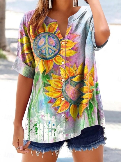 Women's Hippie Peace Sunflower Art Print Casual Cotton and Linen Shirt