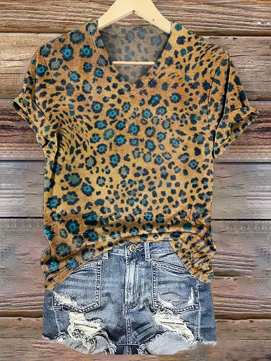 Women's Leopard Pattern Art Print V-Neck Casual T-Shirt