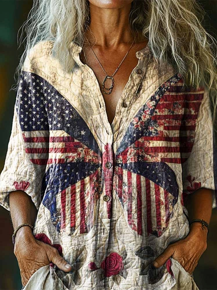 Women's Memorial Day Butterfly Print Casual Cotton Linen Shirt