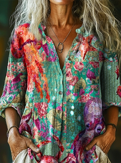 Women's Octopus Garden Art Pattern Print Casual Cotton Linen Shirt