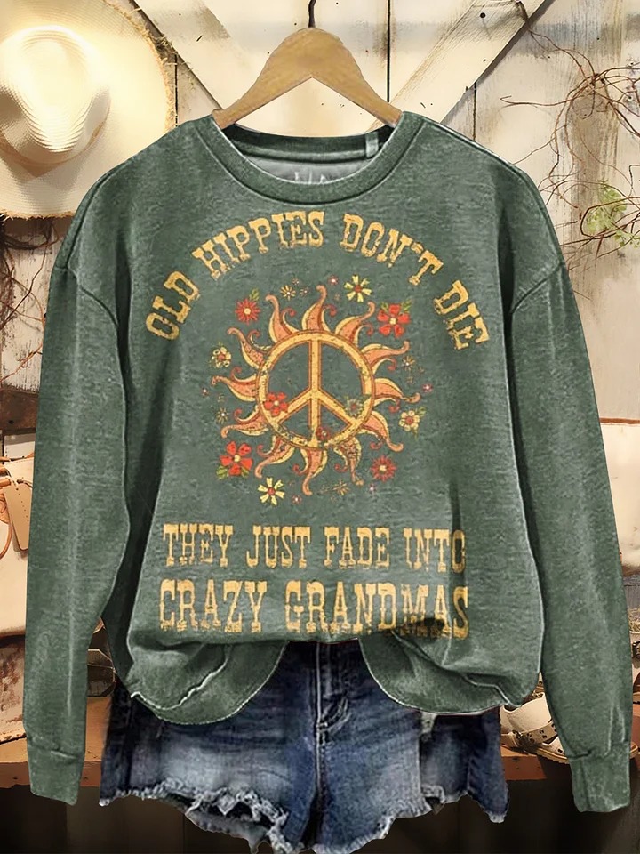 Women's Old Hippies Don't Die They Just Fade Into Crazy Grandmas Print Crew Neck T-shirt