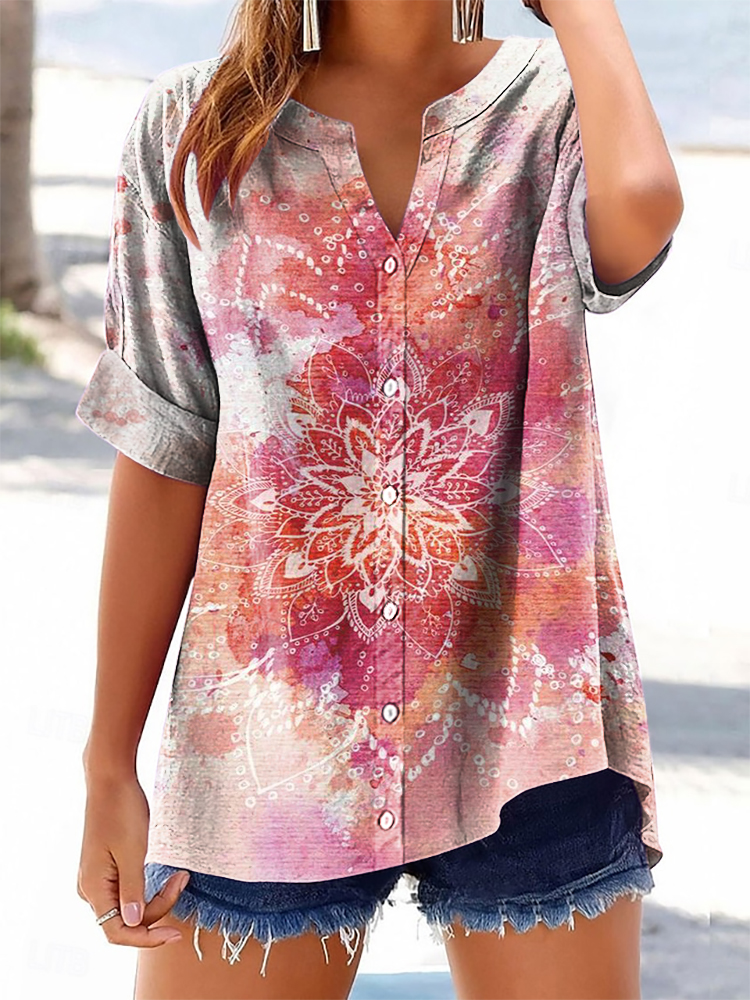 Women's Ombre Tie-Dye Mandala Flower Art Print Casual Cotton And Linen Shirt