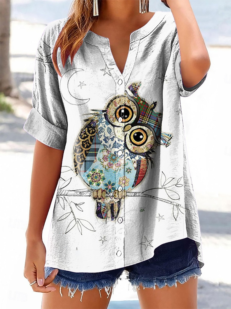 Women's Owl Pattern Art Print Cotton Linen Short Sleeve Shirt