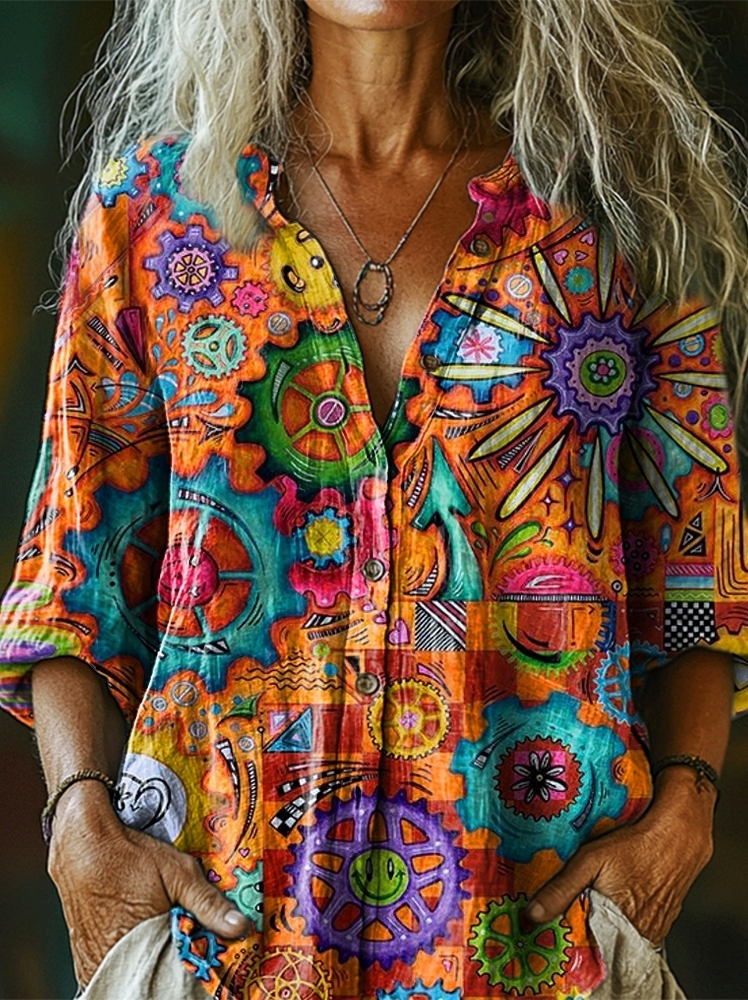 Women's Retro Ethnic Abstract Art Print Casual Cotton Linen Shirt