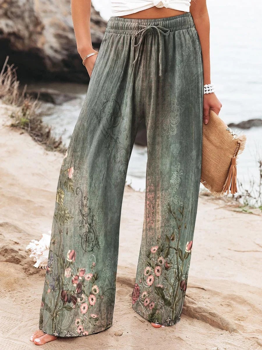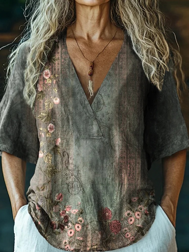 Women's Retro Ethnic Flowers Print V-neck Casual T-Shirt