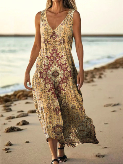Women's Retro Ethnic Totem Art Pattern Print V-neck Sleeveless Cotton Pocket Dress