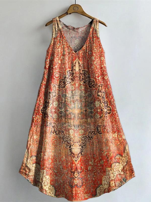 Women's Retro Ethnic Totem Art Print V-neck Pocket Cotton Dress