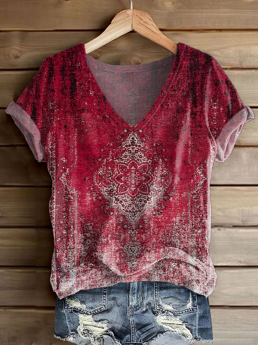 Women's Retro Ethnic Totem Print V-Neck Short Sleeve Cotton T-Shirt