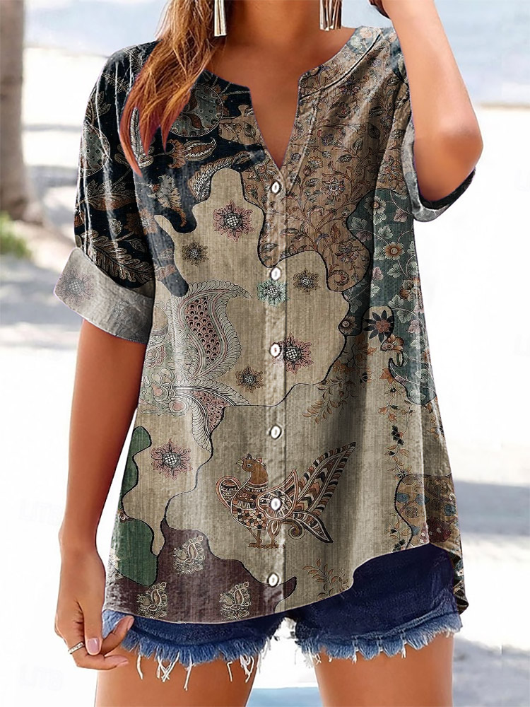 Women's Retro Folk Art Flower Print Casual Cotton And Linen Shirt
