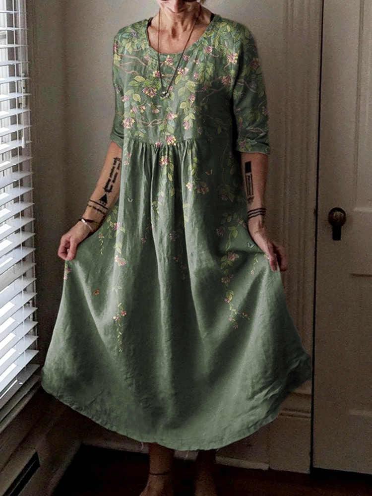 Women's Retro Gradient Flower Art Pattern Print Pocket Cotton Dress