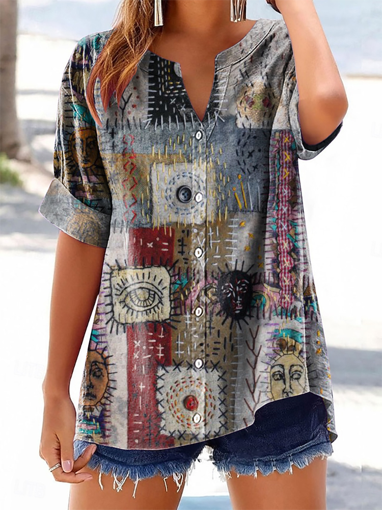 Women's Retro Hippie Ethnic Collage Art Print Casual Cotton and Linen Shirt