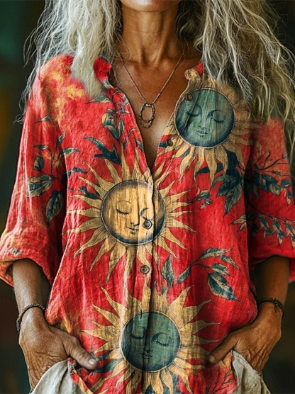 Women's Retro Hippie Sun Art Print Casual Cotton Linen Shirt