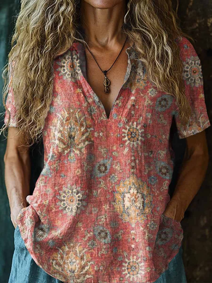 Women's Retro Totem Art Patterns Print Casual Short Sleeve Cotton Shirt