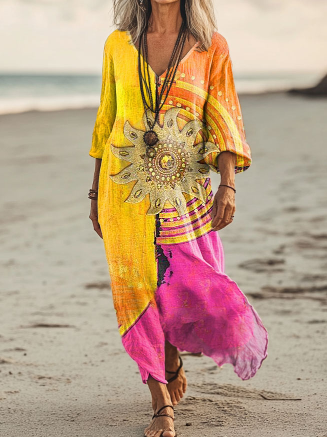 Women's Sun Colorblocked Pattern Art Print Pocket Cotton Dress
