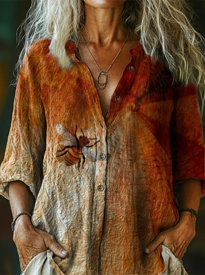 Women's Vintage Bee Art Pattern Print Casual Cotton Linen Shirt