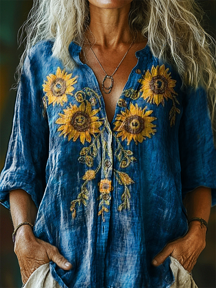 Women's Vintage Bohemian Floral Art Print Casual Cotton Linen Shirt
