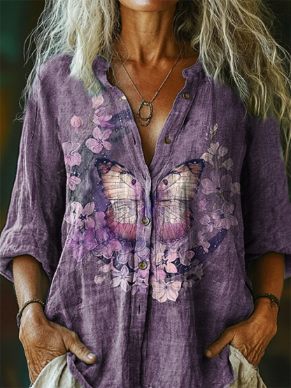 Women's Vintage Butterfly Floral Tattoo Pattern Art Print Casual Cotton Linen Shirt