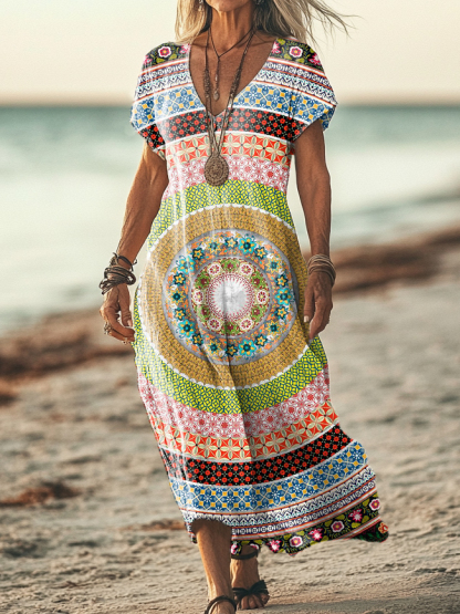 Women's Vintage Datura Floral Art Print Pocket Cotton Dress