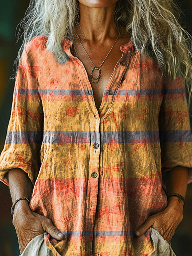 Women's Vintage Dragonfly Art Print Casual Cotton Linen Shirt