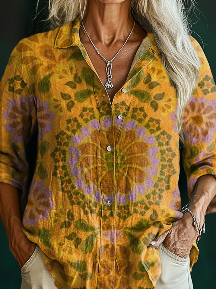Women's Vintage Ethnic Floral Art Pattern Print Casual Cotton Shirt