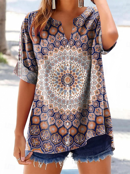 Women's Vintage Ethnic Floral Art Print Casual Cotton And Linen Shirt