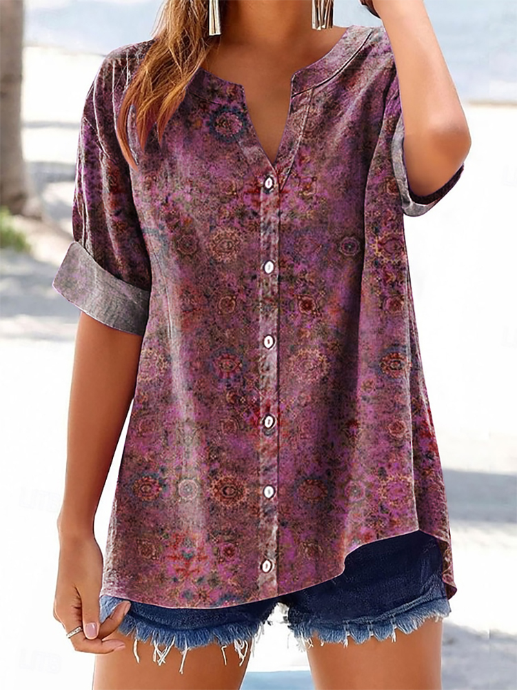 Women's Vintage Ethnic Floral Art Print Casual Cotton And Linen Shirt