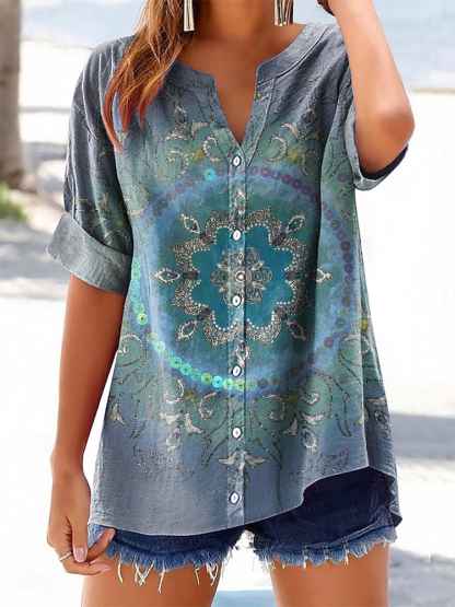 Women's Vintage Ethnic Floral Art Print Casual Cotton And Linen Shirt